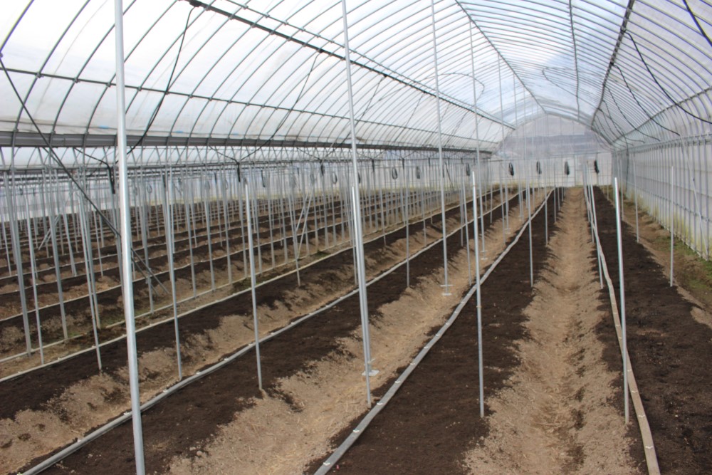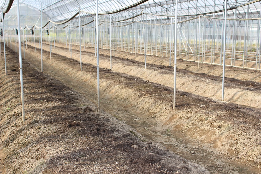 ハウス内の様子です。 菜種かす・発酵鶏糞・堆肥などを撒きました、黒く見えるのが堆肥です。 中心に見える太いパイプは、雪による倒壊を防ぐ柱、堆肥の上に白く見えるのは灌水ホースです。 2021年1月31日撮影 |
