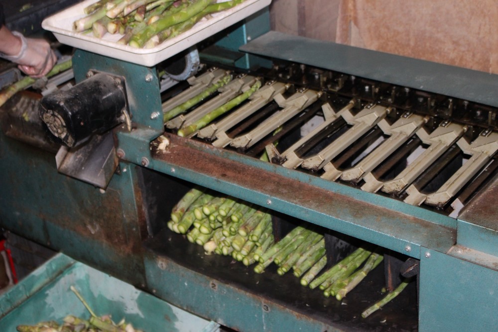 選果機により選別。 アスパラガスの出荷は大きさを揃えるため選果機で選別し、既定のグラムに束ねて出荷します。 2021年3月20日撮影 |