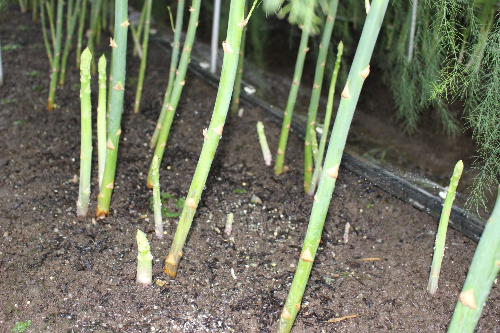 アスパラガスの夏秋取りが最盛期です。 伸ばしている茎の間から、収穫を行うアスパラガスが出ています。 2021年7月29日撮影 |